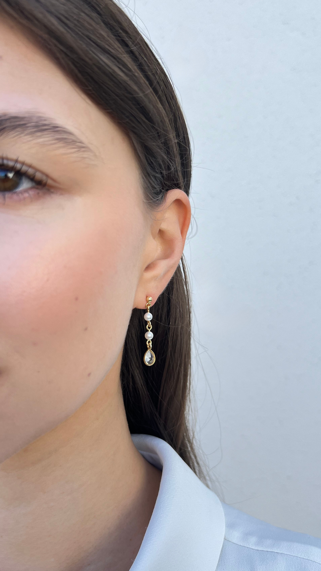 Kolczyki Dea zostały wykonane ze srebra próby 925, pokrytego 18-karatowym złotem oraz ozdobione perłą muszlową i kryształem górskim.