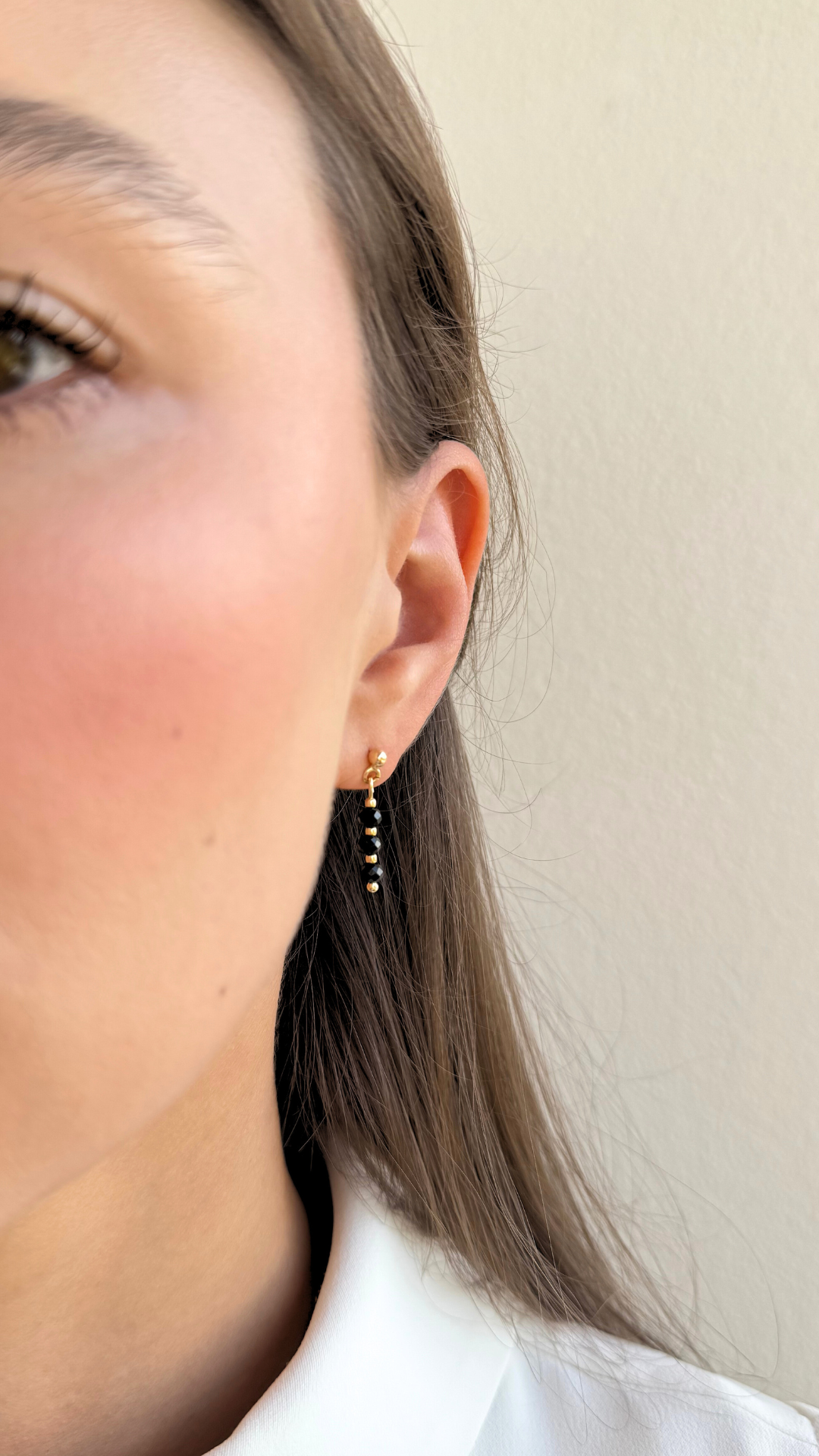 Kolczyki Eterna zostały wykonane ze srebra próby 925, pokrytego 18-karatowym złotem i naturalnego czarnego turmalinu.