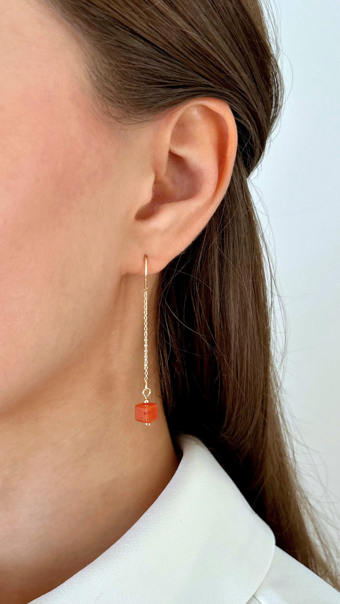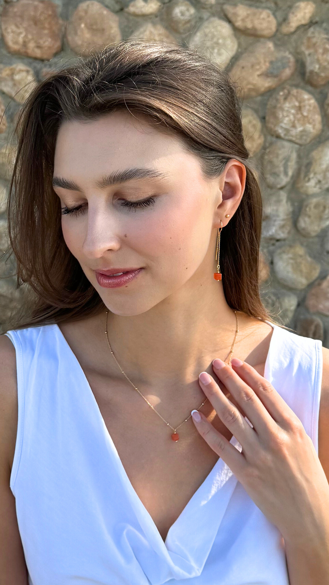 Komplet Aria to zestaw biżuterii, w skład którego wchodzą naszyjnik oraz kolczyki, oba wykonane ze srebra próby 925, pokrytego 18-karatowym złotem i ozdobione naturalnym kamieniem karneolu.