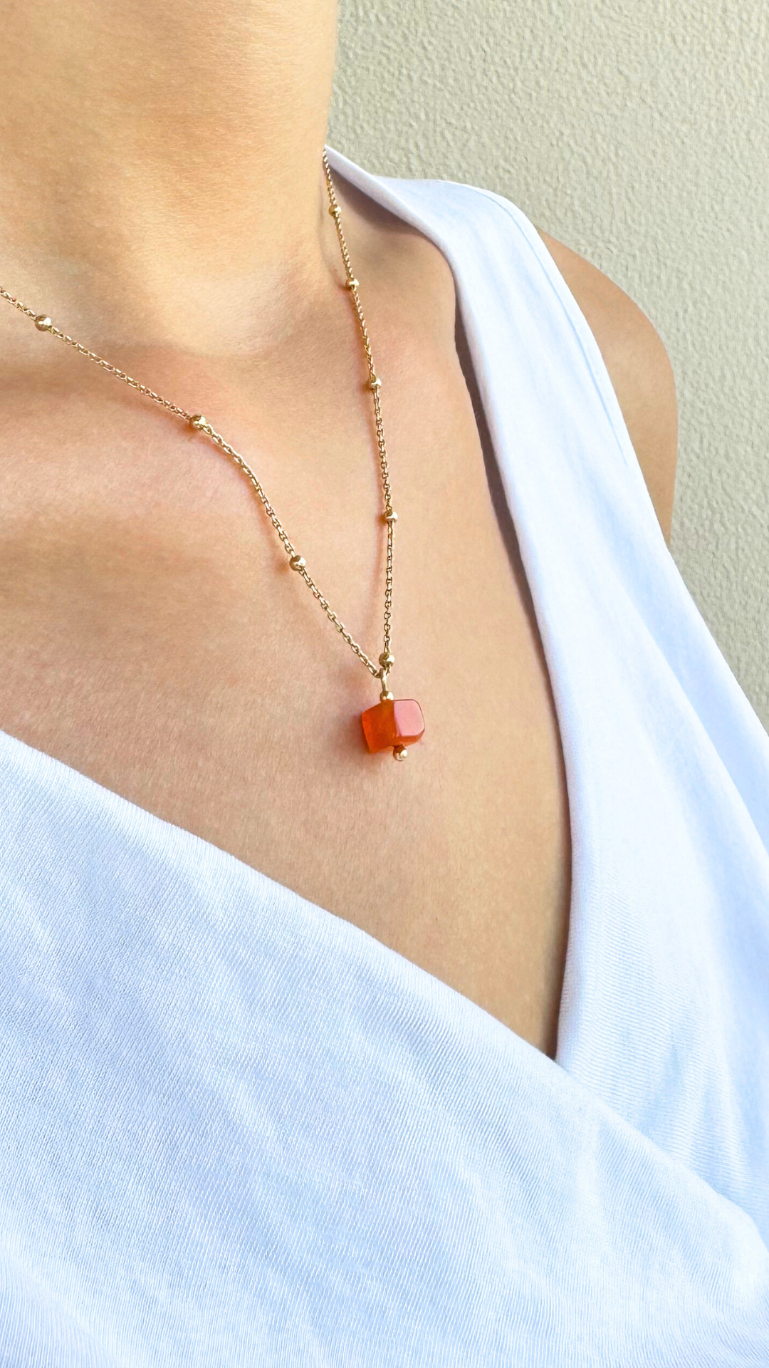 Naszyjnik Aria został wykonany z łańcuszka z kuleczkami ze srebra próby 925, pokrytego 18-karatowym złotem, oraz z zawieszki z naturalnym kamieniem karneolu.