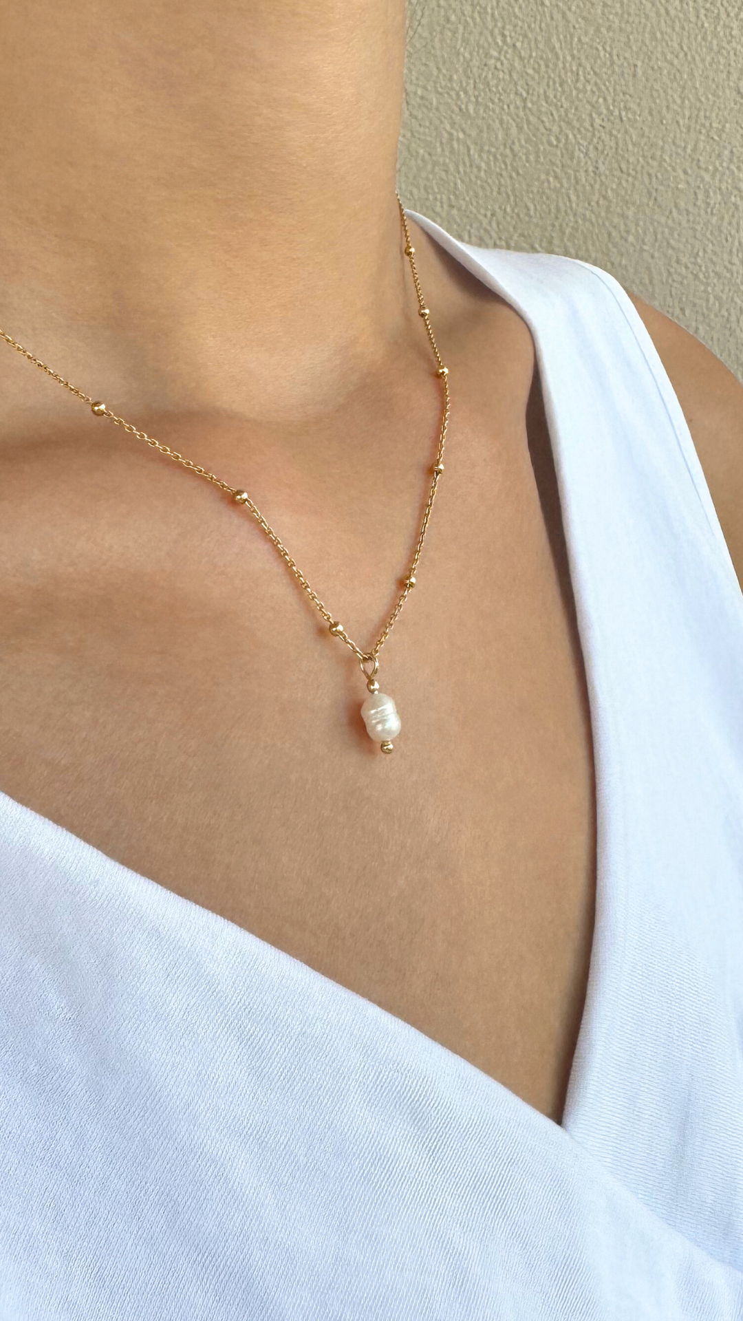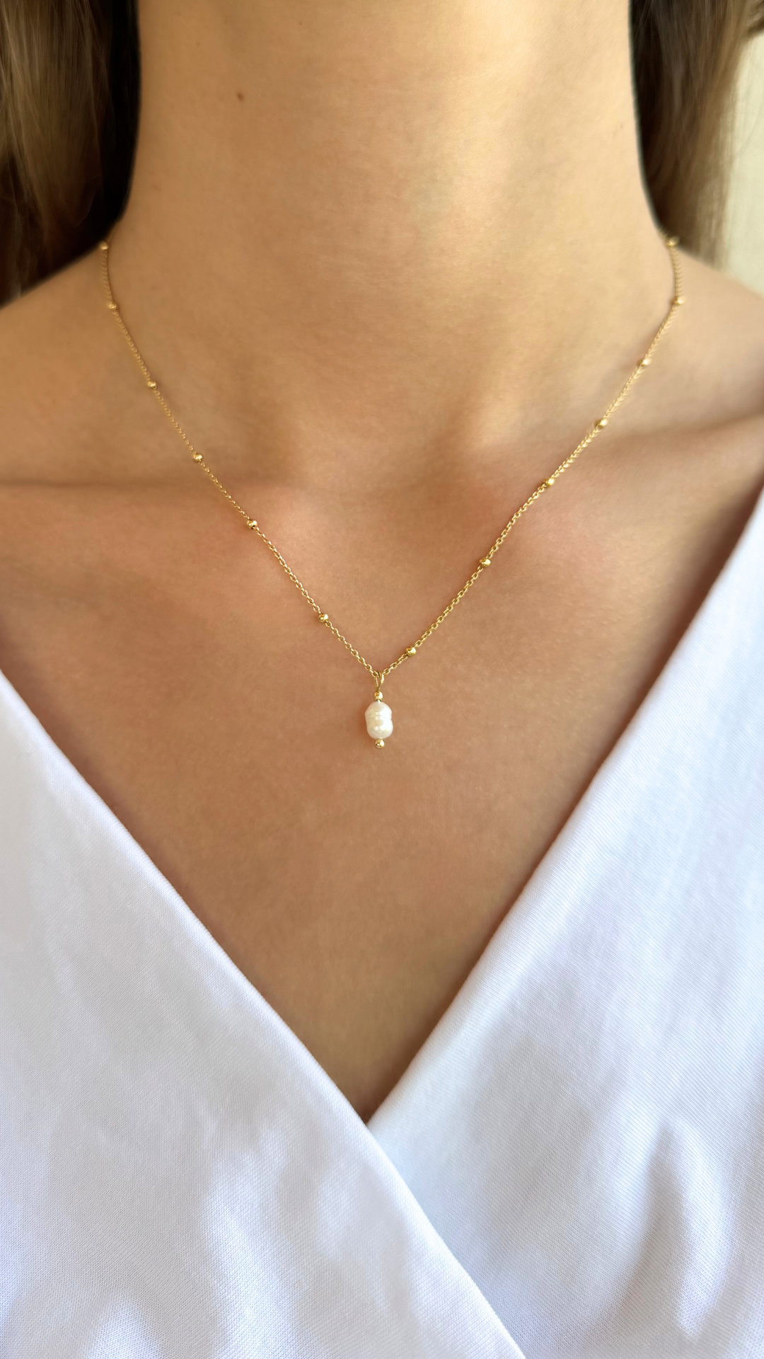 Naszyjnik Clara został wykonany z łańcuszka z kuleczkami ze srebra próby 925, pokrytego 18-karatowym złotem, oraz z zawieszki z naturalną perłą słodkowodną.